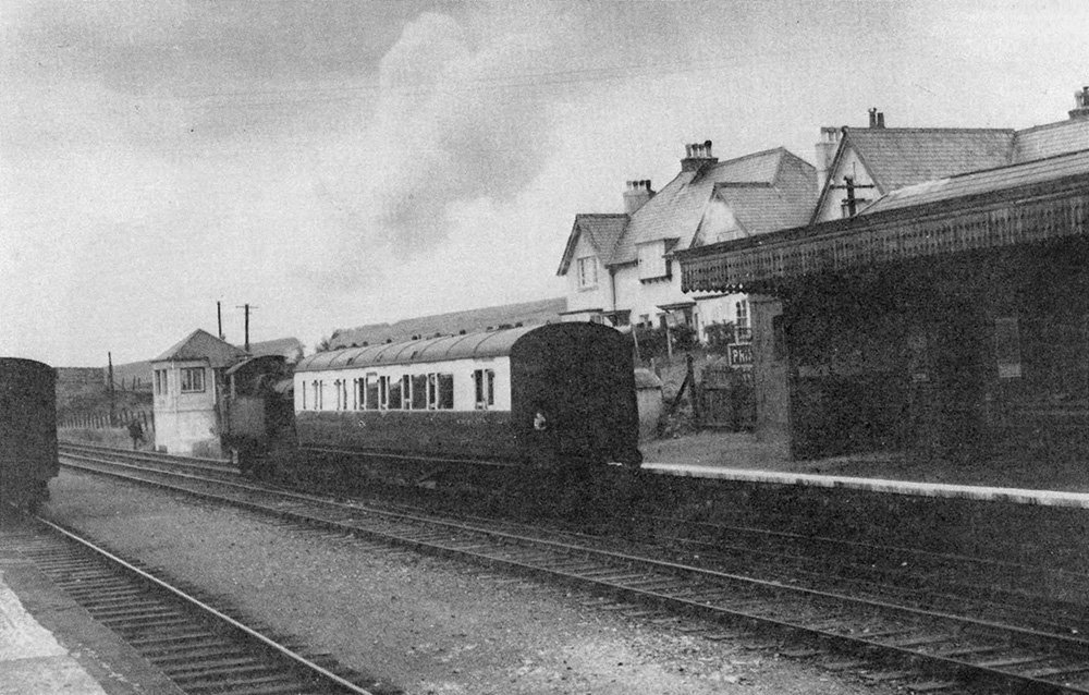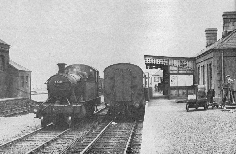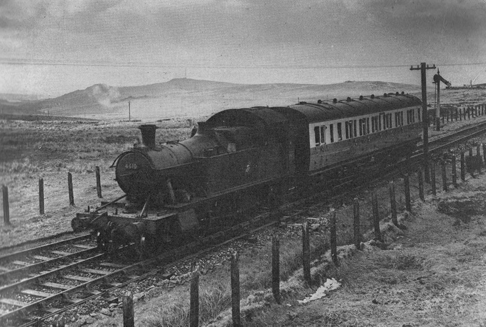 This was just on the outskirts of Princetown. No 4410 enters the with the 2.51 p.m. ex Yelverton train in the early 1950s. In the foreground can be seen Leeden Tor above the coach and Sharpitor, with its R.A.F. mast against the skyline. – Image credit: Western Morning News