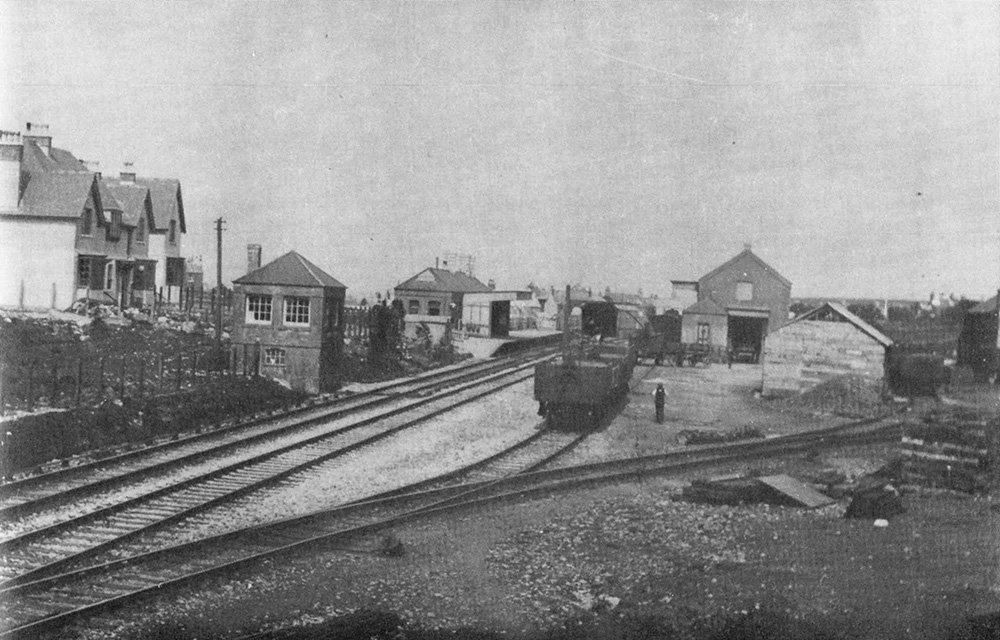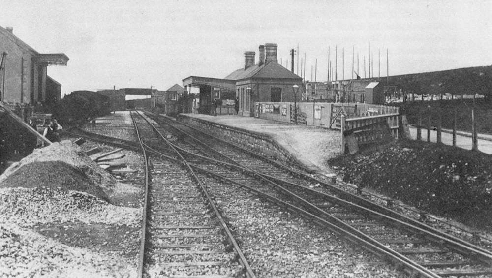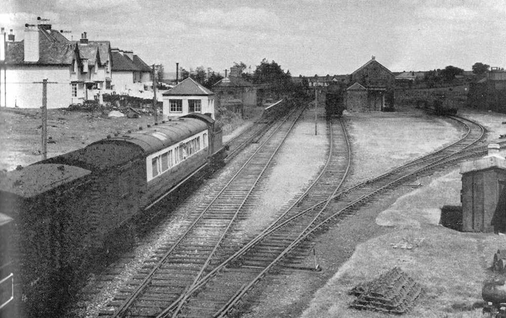 Pulling into the platform. View of the station and goods yard from the bridge at the west end.