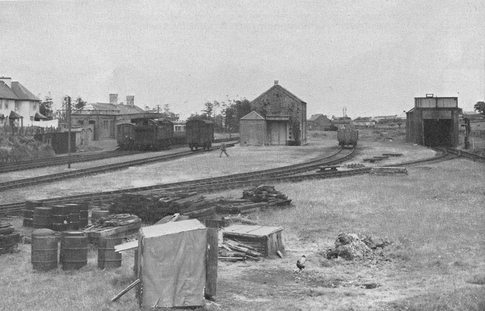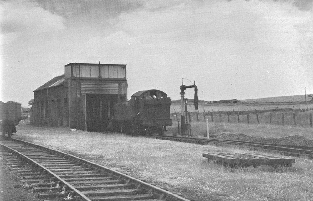Shunting duties taking place at Princetown Station, showing a general view of the engine shed and goods yard.