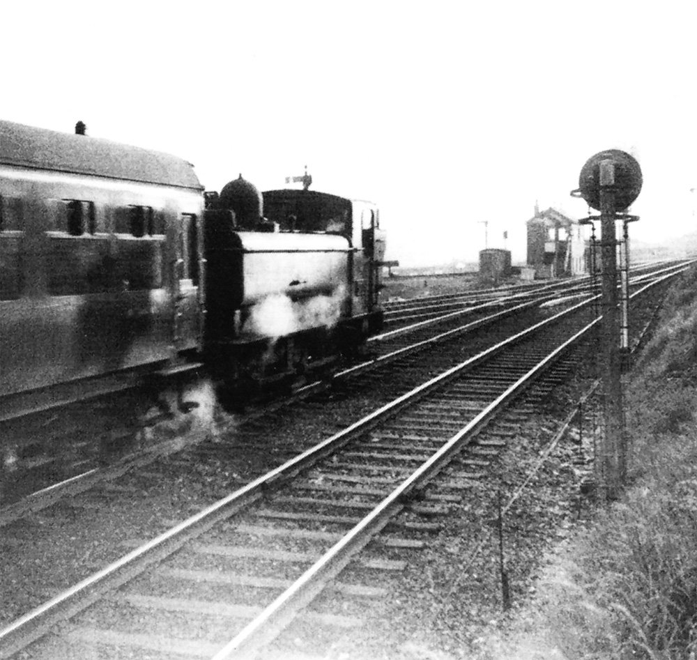 No 6419 approaches the junction with a train from Tavistock, on 15th May 1960. The signal box opened in April 1891 and was used until November 1960, when the Plymouth Panel took over its function. It had 35 levers at that time and was one of the busiest boxes in the area. Image by M Dart.