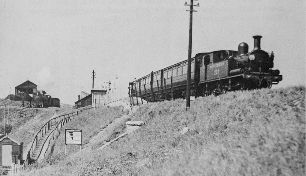 A Class 02 No. 207 heads the Turnchapel train away from Lucas Terrace on the 22nd of May 1935. A Class T9 is being turned on the turntable in the background. Image by H. C. Casserley