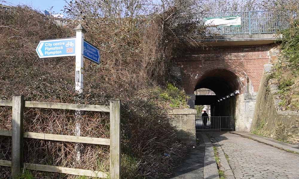 The underpass is still there and is used to get to St Judes. The signpost shows that you can walk a lot of the old line to Pymstock and Plympton.