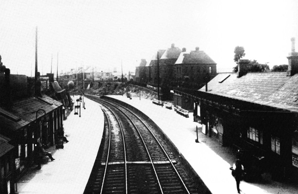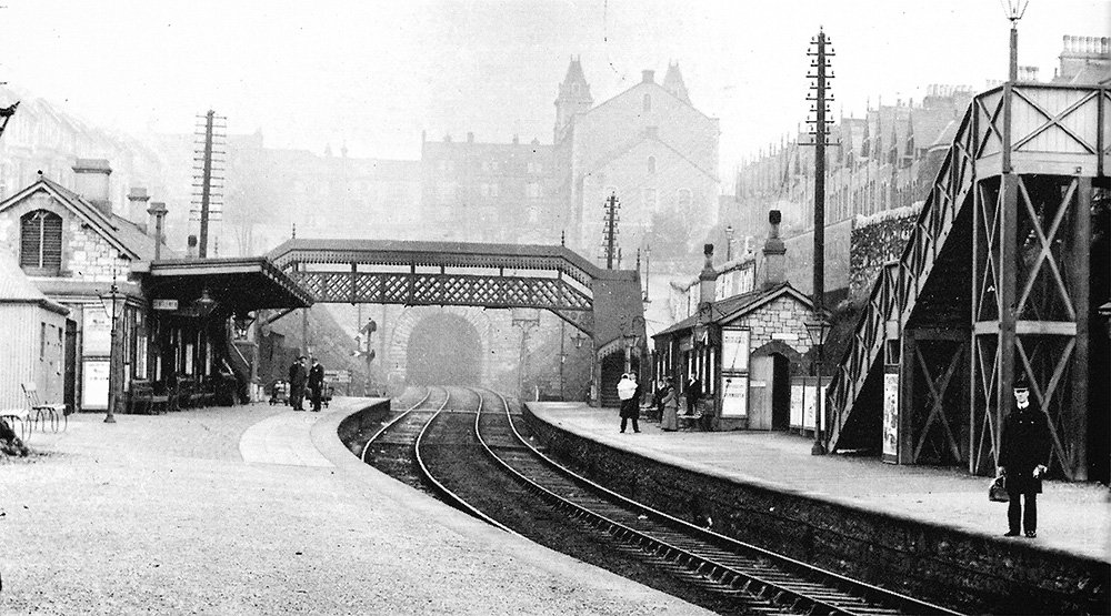 A view of the station showing the southern end of the tunnel, above lies Multey Plain. Adjacent to it can be seen the Baptist Church. Taken circa 1921. Image by LGRP.