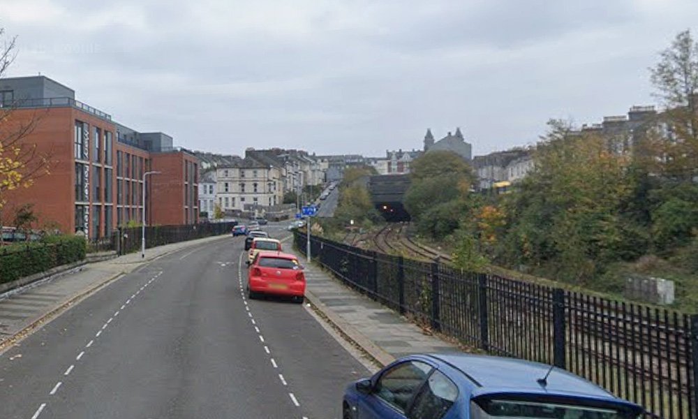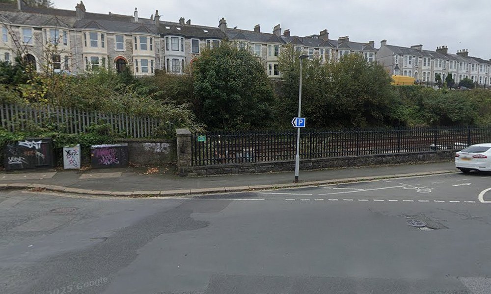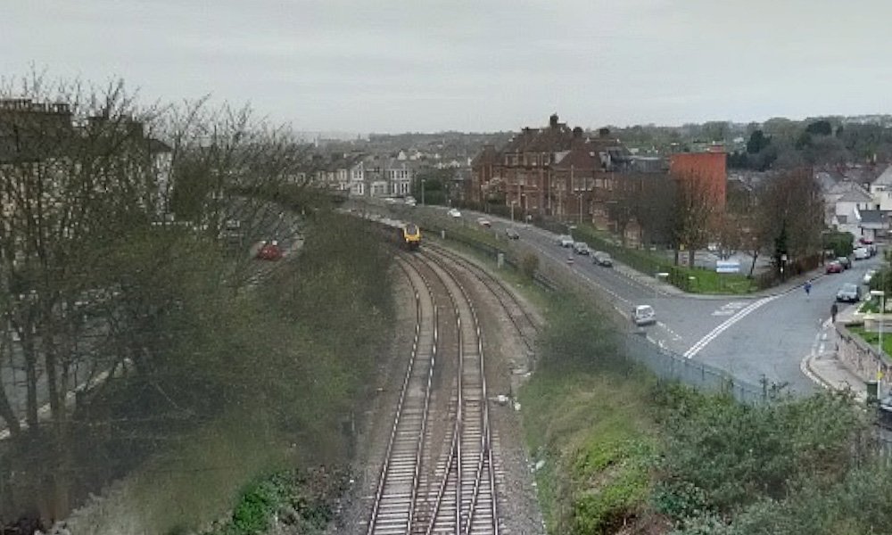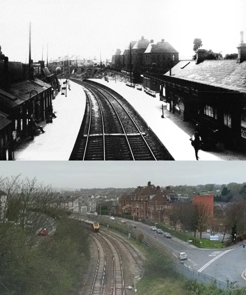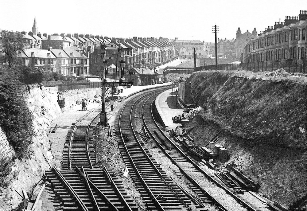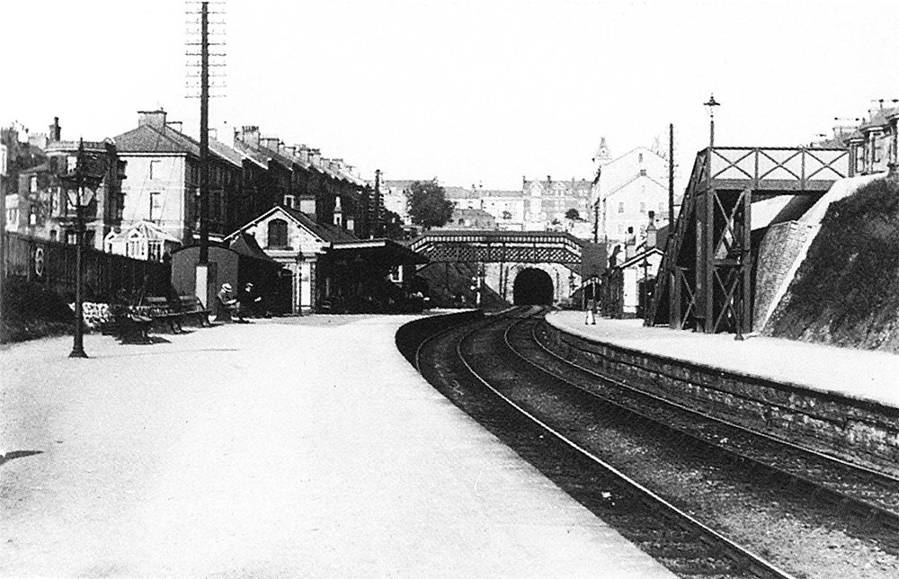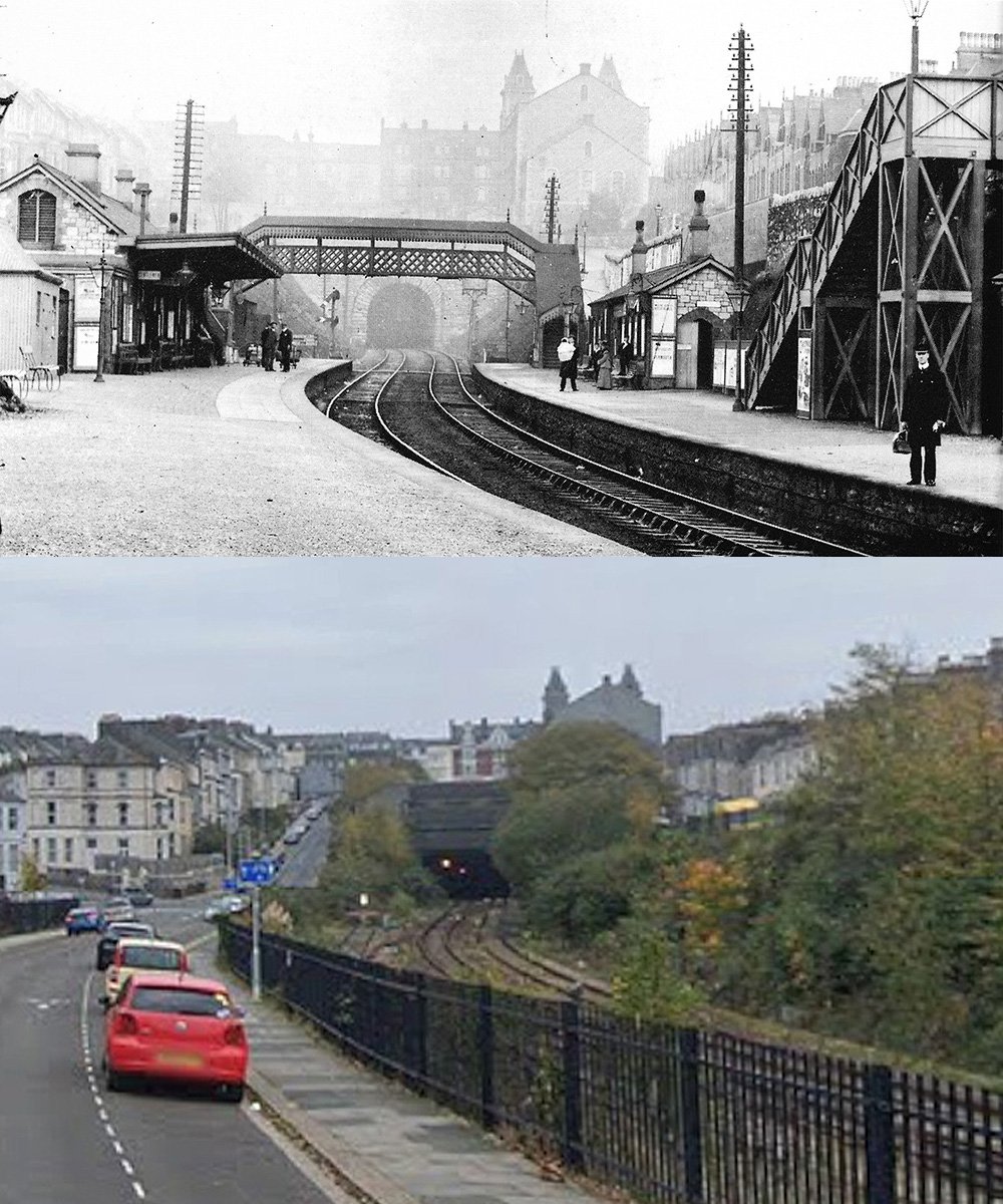 This is from Apsley Road, just beyond the Sutherland Road bridge. You can see Station Road, heading up to Mutley Plain, and just to the right, the tunnel heading under it. Just to the left, and out of shot, would have been the Eye Infirmary, the building you can see is ‘new’, and student accommodation. Again, sadly nothing is left of the station.