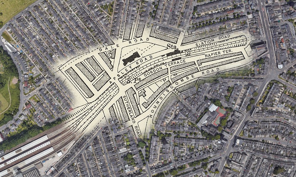 This was taken at the end of Napier Car Park, looking towards the North Road, and the building that used to be the Eye Infirmary. The junction goes off to Apsley Road, with Dale Road branching off to the right. Where all the brushes are, both sides, is where the station was.